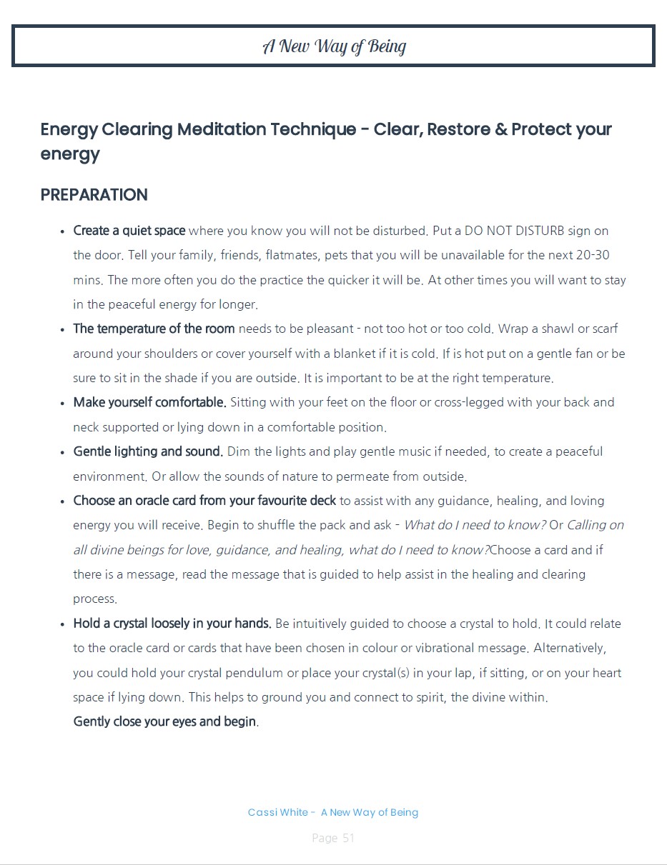 At the heart of the book is a powerful daily practice — a guided energy-clearing meditation — that will help you release emotional burdens, dissolve negative energies, and cultivate an unshakable sense of inner peace. Each lesson explores essential themes such as self-love, patience, presence, and the profound power of trust. Through heartfelt guidance, Cassi White invites readers to experience the limitless potential of love, embrace their unique spiritual journey, and rediscover the beauty of simply being.